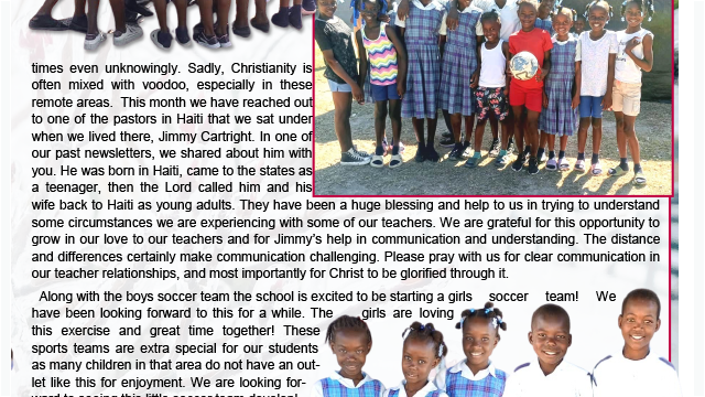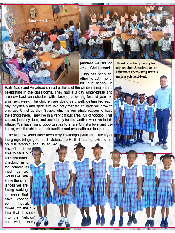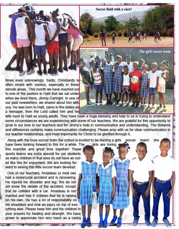 The last few years have been very challenging with the difficulty of the gangs bringing so much violence to Haiti. It has put extra strain on our schools and us as we haven’t been able to have our administrators checking in on the schools as much as we would like. We know the challenges we are facing working in areas that have voodoo so heavily mixed into the culture that it seeps into the “religion” as well, many times even unknowingly. Sadly, Christianity is often mixed with voodoo, especially in these remote areas. This month we have reached out to one of the pastors in Haiti that we sat under when we lived there, Jimmy Cartright. In one of our past newsletters, we shared about him with you. He was born in Haiti, came to the states as a teenager, then the Lord called him and his wife back to Haiti as young adults. They have been a huge blessing and help to us in trying to understand some circumstances we are experiencing with some of our teachers. We are grateful for this opportunity to grow in our love to our teachers and for Jimmy’s help in communication and understanding. The distance and differences certainly make communication challenging. Please pray with us for clear communication in our teacher relationships, and most importantly for Christ to be glorified through it.