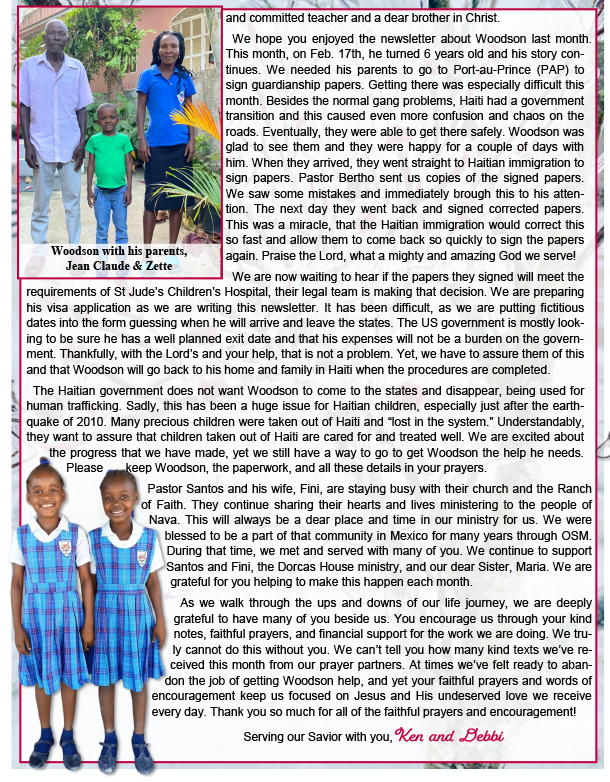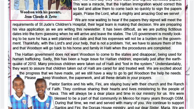 We are now waiting to hear if the papers they signed will meet the requirements of St Jude’s Children’s Hospital, their legal team is making that decision. We are preparing his visa application as we are writing this newsletter. It has been difficult, as we are putting fictitious dates into the form, guessing when he will arrive and leave the states. The US government is mostly looking to be sure he has a well-planned exit date and that his expenses will not be a burden on the government. Thankfully, with the Lord’s and your help, that is not a problem. Yet, we have to assure them of this and that Woodson will go back to his home and family in Haiti when the procedures are completed.