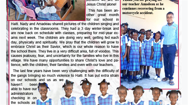 This has been another great month for our school in Haiti. Nady and Amadeau shared pictures of the children singing and celebrating in the classrooms. They had a 3 day winter-break and are now back on schedule with classes, preparing for mid-year exams next week. The children are doing very well, getting fed each day, physically and spiritually. We pray that the children will grow to embrace Christ as their Savior, which is our whole reason to have the school there. They live in a very difficult area, full of voodoo. This causes jealousy, fear, and uncertainty for the families who live in this village. We have many opportunities to share Christ’s love and patience with the children, their families and even with our teachers.